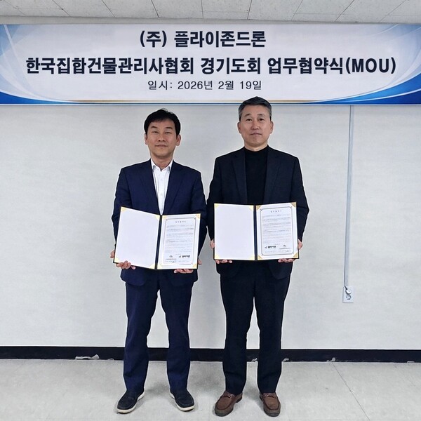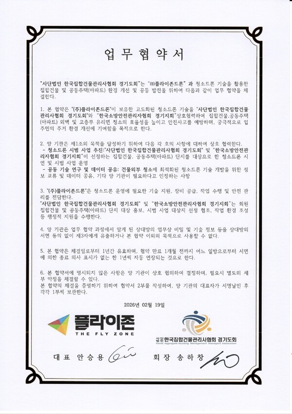 (주)플라이존드론(대표 안승용)과 사단법인 한국집합건물관리사협회 경기도회(회장 송하창)가 청소 드론 기술을 활용한 집합건물 및 공동주택(아파트)의 환경 개선과 공동 발전을 위한 업무 협약(MOU)을 체결했다.