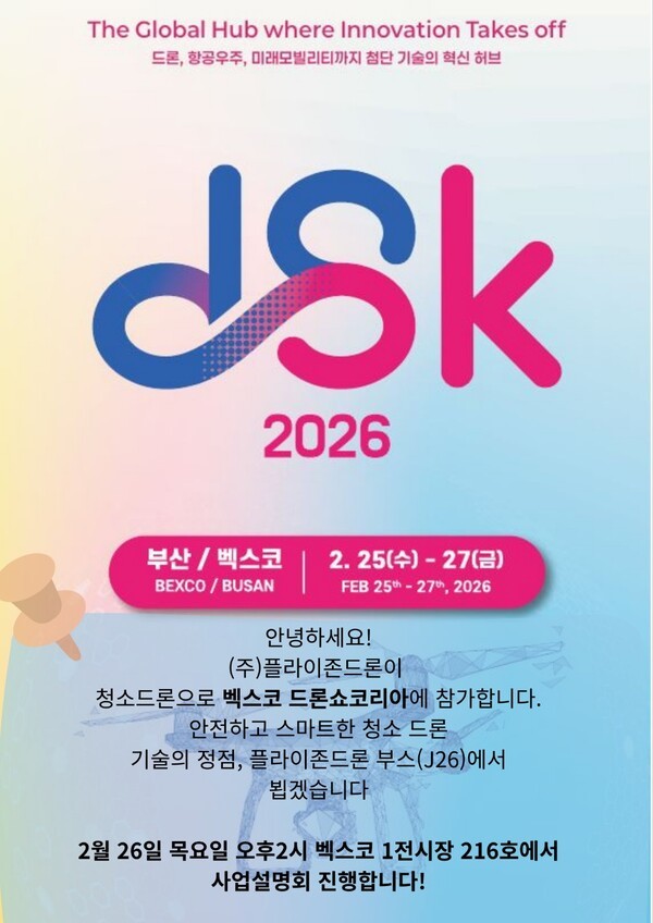 국내 드론 산업의 기술력과 실용성을 동시에 보여줄 플라이존드론의 이번 행보가 드론쇼코리아 2026의 주요 관전 포인트 중 하나로 떠오르고 있다. 부산 벡스코에서 펼쳐질 청소드론의 혁신이 산업 현장에 어떤 변화를 가져올지 귀추가 주목된다.
