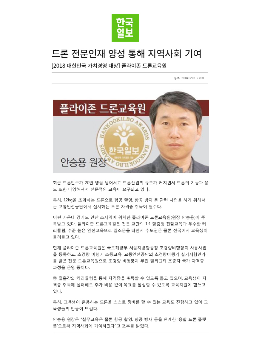 최고의 드론 전문 교육기관을 향하는 플라이존드론교육원